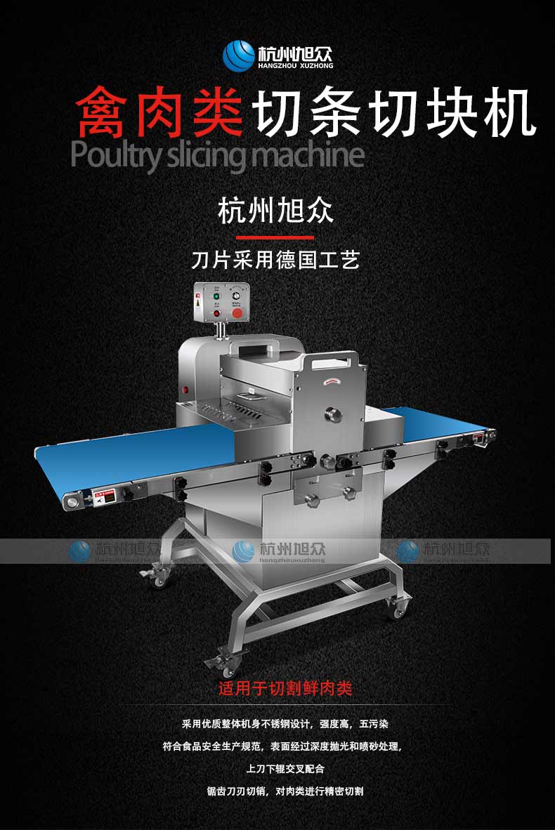 杭州旭眾新品:XZ-QT500禽肉類切條切塊機,一款適用于各種禽肉類切條切塊的設備,大大的加強了人們的工作效率,相應的也就節(jié)省了人力資源,進而也就減少了餐飲業(yè)的運營成本,加強了餐飲業(yè)的利潤空間